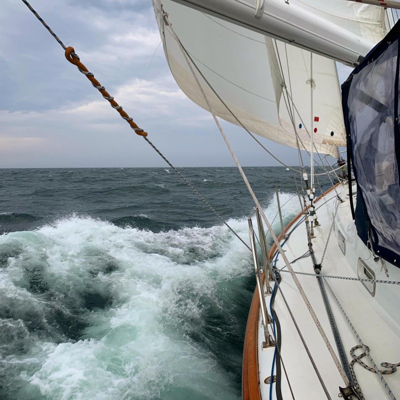 With Cape May to port, we began receiving favorable winds to allow us to point offshore and begin using the wind. As we sailed in the North Atlantic below Long Island sound for about 2 days, the winds steadily increased until we had to take the headsails down in the middle of the night.